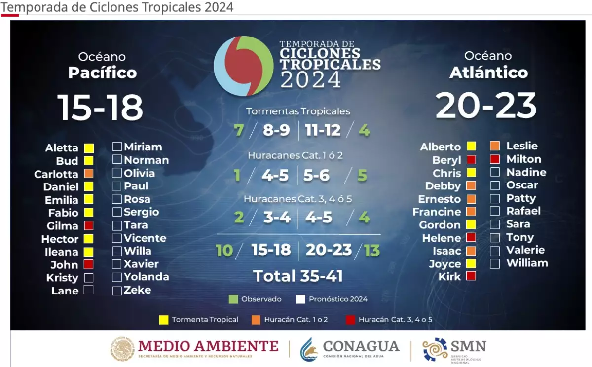 La temporada de huracanes en el Pacífico inició el 15 de mayo, mientras que en el Atlántico fue el 1 de junio, en ambos casos finalizará el 30 de noviembre, según las estimaciones de la Conagua, que espera entre 35 y 41 ciclones, depresiones tropicales, tormentas tropicales y huracanes.